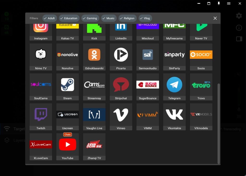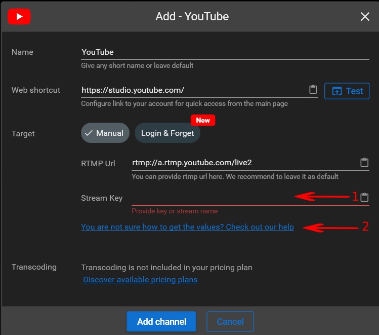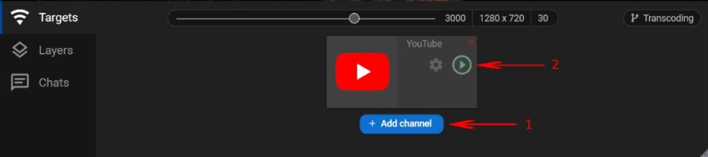 Step 6. If you need to stream to several platforms, click the “Add channel” button (1) again. To start your stream to the platform, click the “Play” button (2).