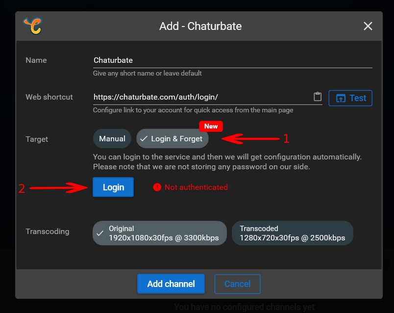 Step 4. Set up your streaming channel using the “Login & Forget” option (1). Click the “Login” button (2) and authenticate to the cam site using your credentials. You can find the detailed guides for each cam site here