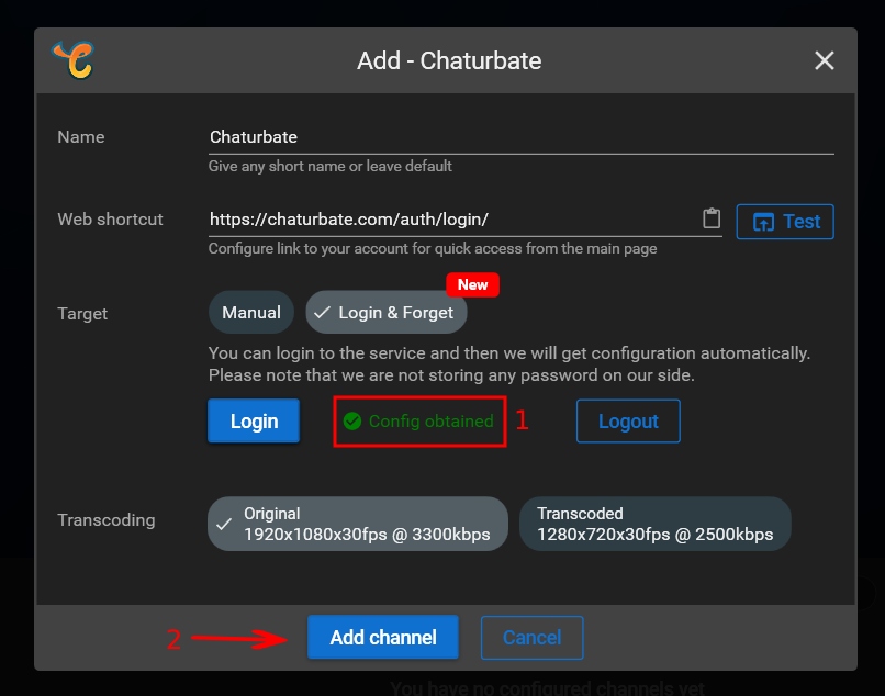 Step 5. Once your cam site is connected, you will see the “Config obtained” status (1). Click the “Add channel” button (2) to complete the setup.