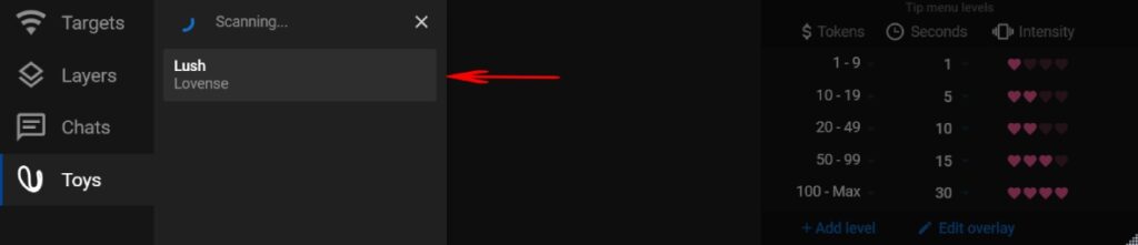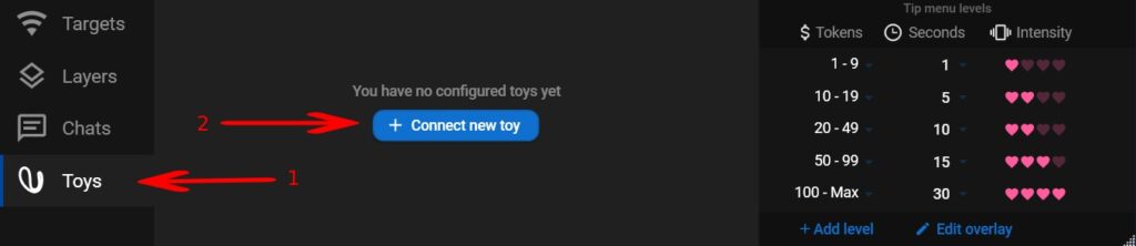 Step 9. Once your device is connected, you will see the “Connected” status on your “Toys” tab. Set vibration levels by changing the number of tokens, duration, and intensity.