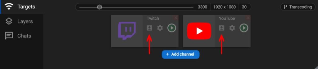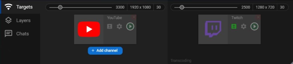 Now you can see two setting bars, where you can, select Resolution, FPS, and bitrate according to your pricing plan limits for the original and transcoded streams. Then assign your streaming channels to the original or transcoded quality. Thus, you’ll have 2 groups of channels with a different video quality.